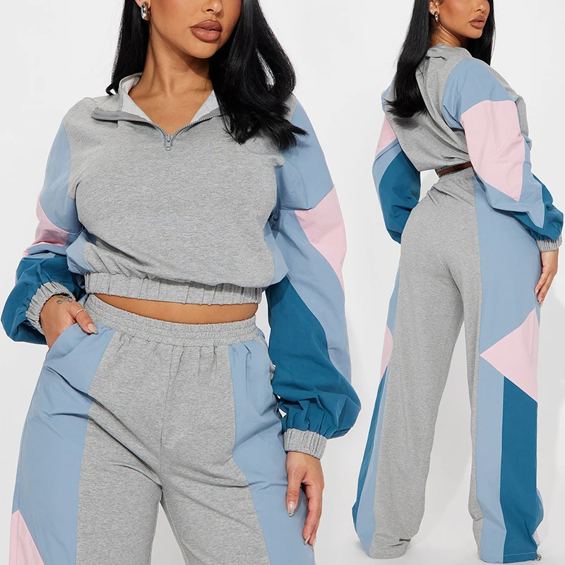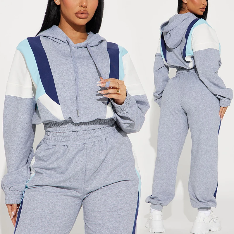 Huili Oem Color Block Sportswear Y2K Workout Women Activewear Custom Logo Tracksuits Crop Top Hoodie and Joggers 2 Piece Set